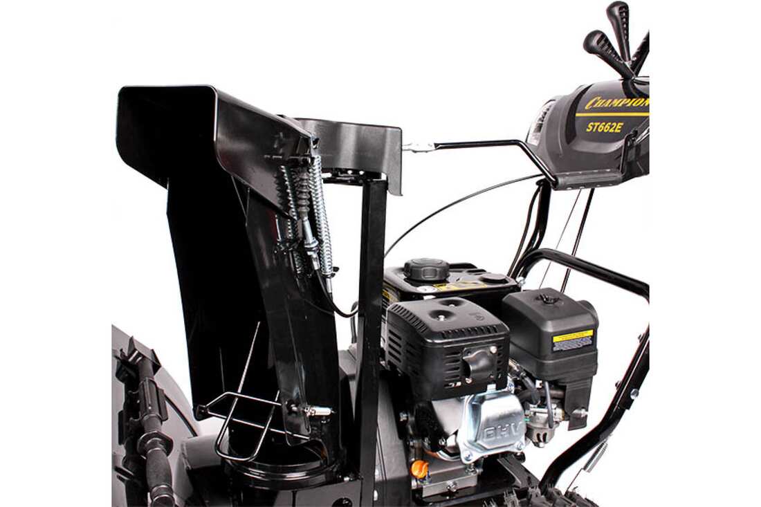 Дефлектор. Изготовлен из металла - это рукоятка, которая находится на корпусе в удобном месте и позволяет перенаправлять выброс снега до 190 градусов.